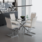 Strong Material and Proper Size: Our modern glass dining table is made of clear tempered glass and sliver legs, which are sturdy and durable while easy to clean. 4 PVC dining chairs are ergonomically designed to provide you with optimal comfort, with upholstered backs and soft padding for the best using experience. The overall size of the dining table is 31.5" x 47.24" x 29.5" and the chairs measure 25.5" x 16.5" x 38.5"